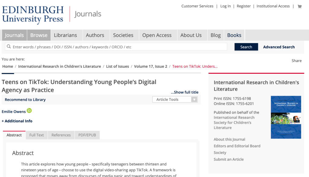Abstract: This article explores how young people – specifically teenagers between thirteen and nineteen years of age – choose to use the digital video-sharing app TikTok. A framework is proposed that moves away from discourses of media panic and toward understandings of media practice, analysing two videos created by teenagers to develop a vocabulary for identifying the diverse and nuanced ways in which young people negotiate their social lives through the use of TikTok.